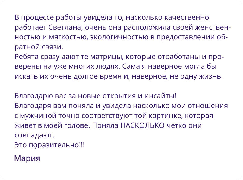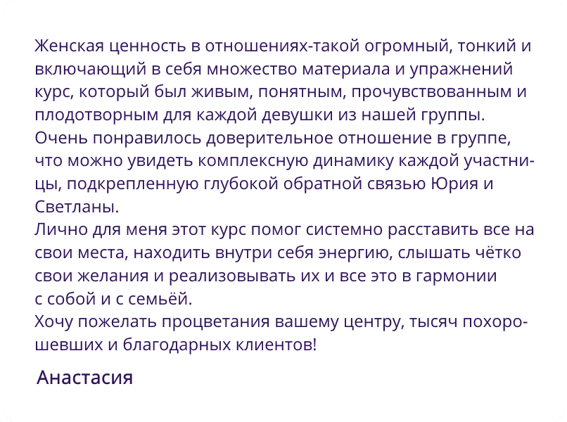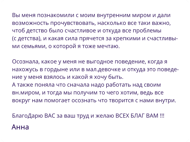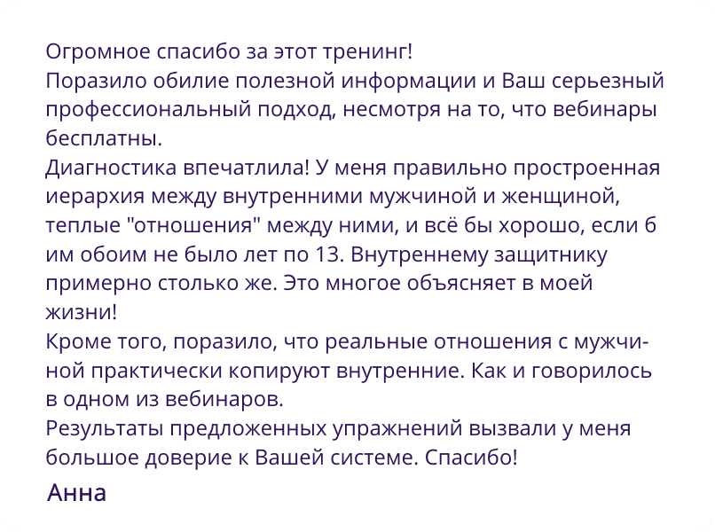 У меня было так, что все нормально - а счастья нет. И этот тренинг дал понимание, что именно не так и что нужно сделать, чтобы было лучше.
